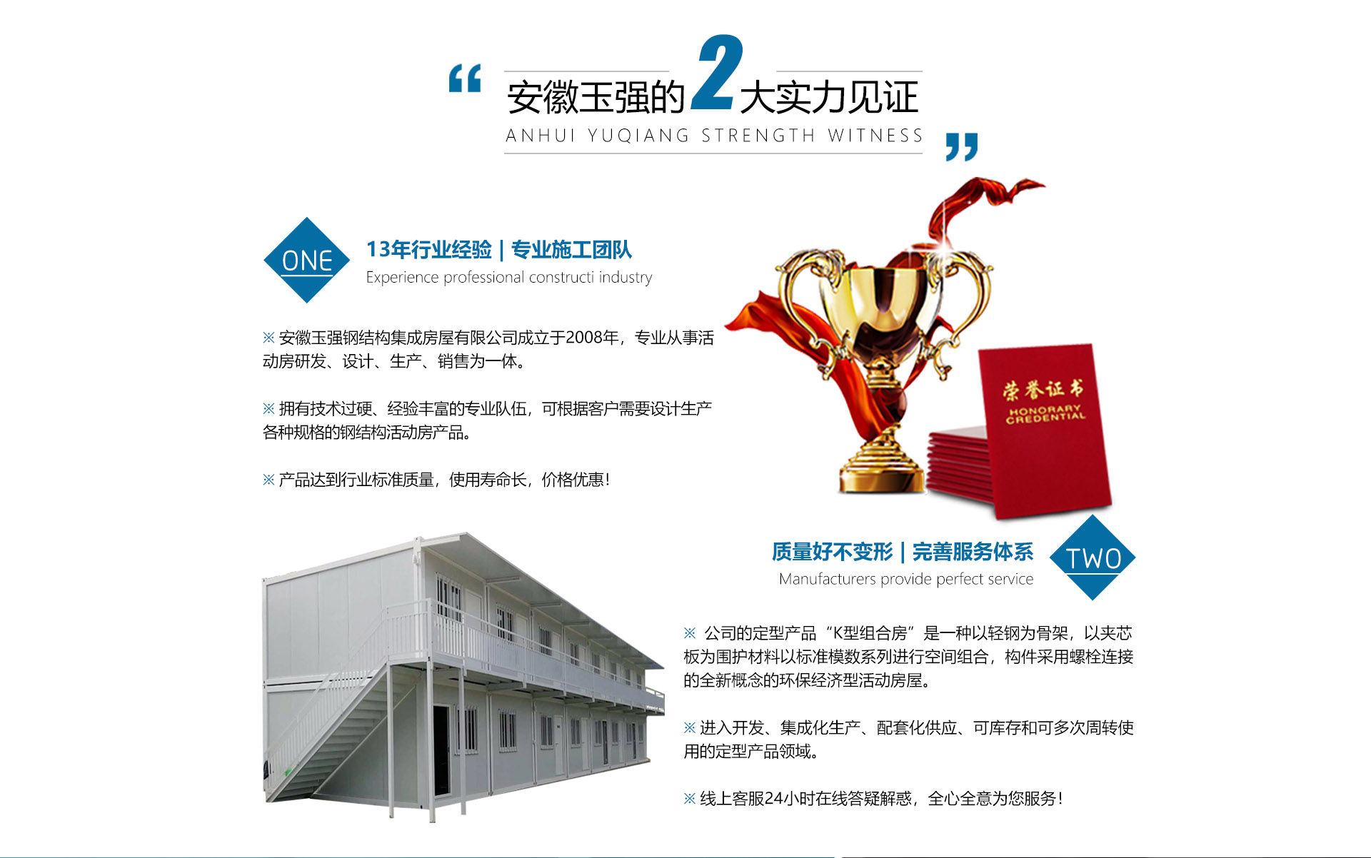 安徽玉強鋼結構集成房屋有限公司是一家集研發、設計、生產、銷售服務于一體的活動房與集裝箱制造企業,公司隊伍具有多年鋼結構制作及產品檢測經驗,嚴格按照鋼結構標準要求制作、檢測。致力于提供研、產、銷、于一體,有著多年積累的先進生產技術和豐富工作經驗,采用精良的工藝技術,生產美觀大方的定型產品,長期以來,受廣大用戶的信賴和支持。歡迎您的來電咨詢。